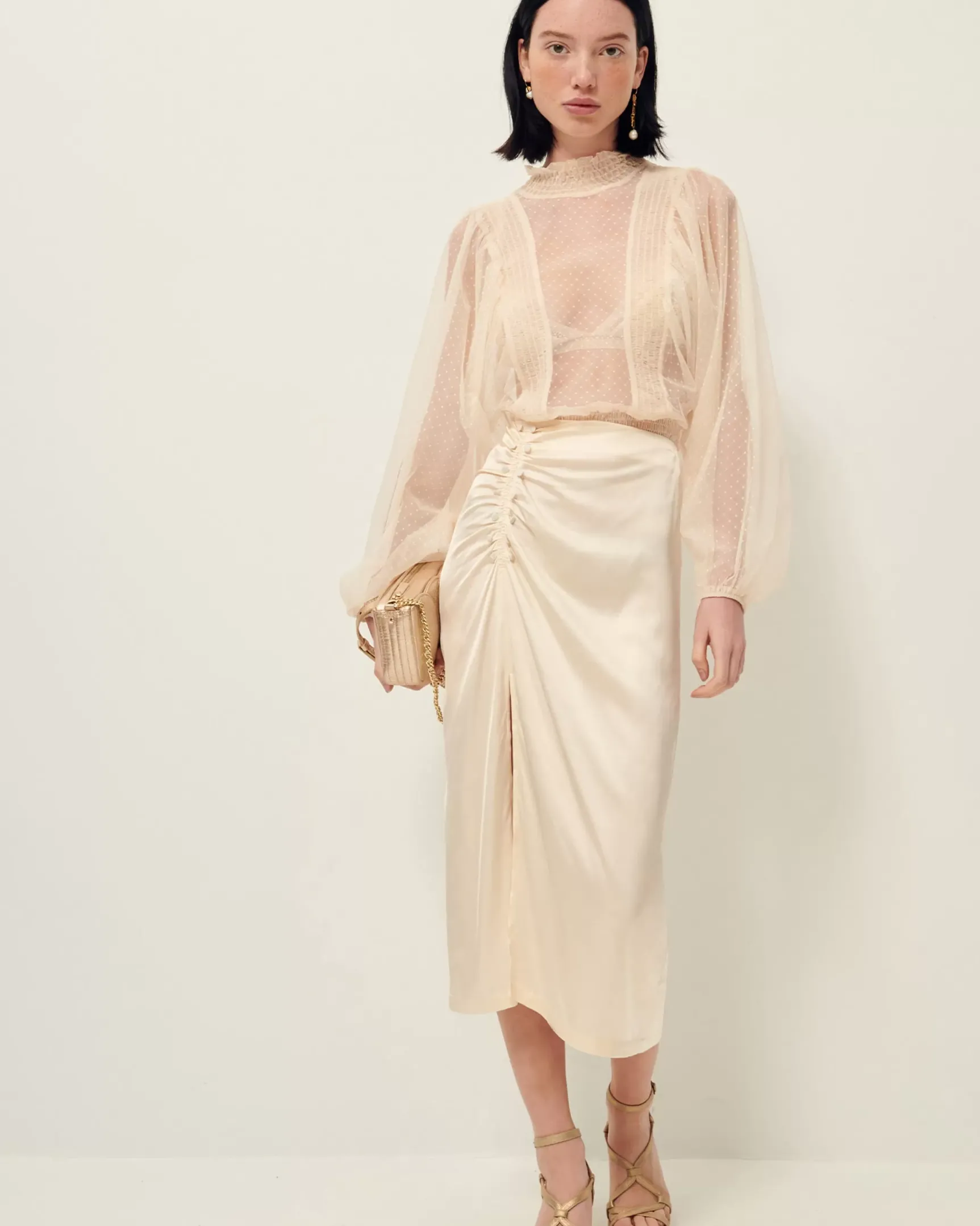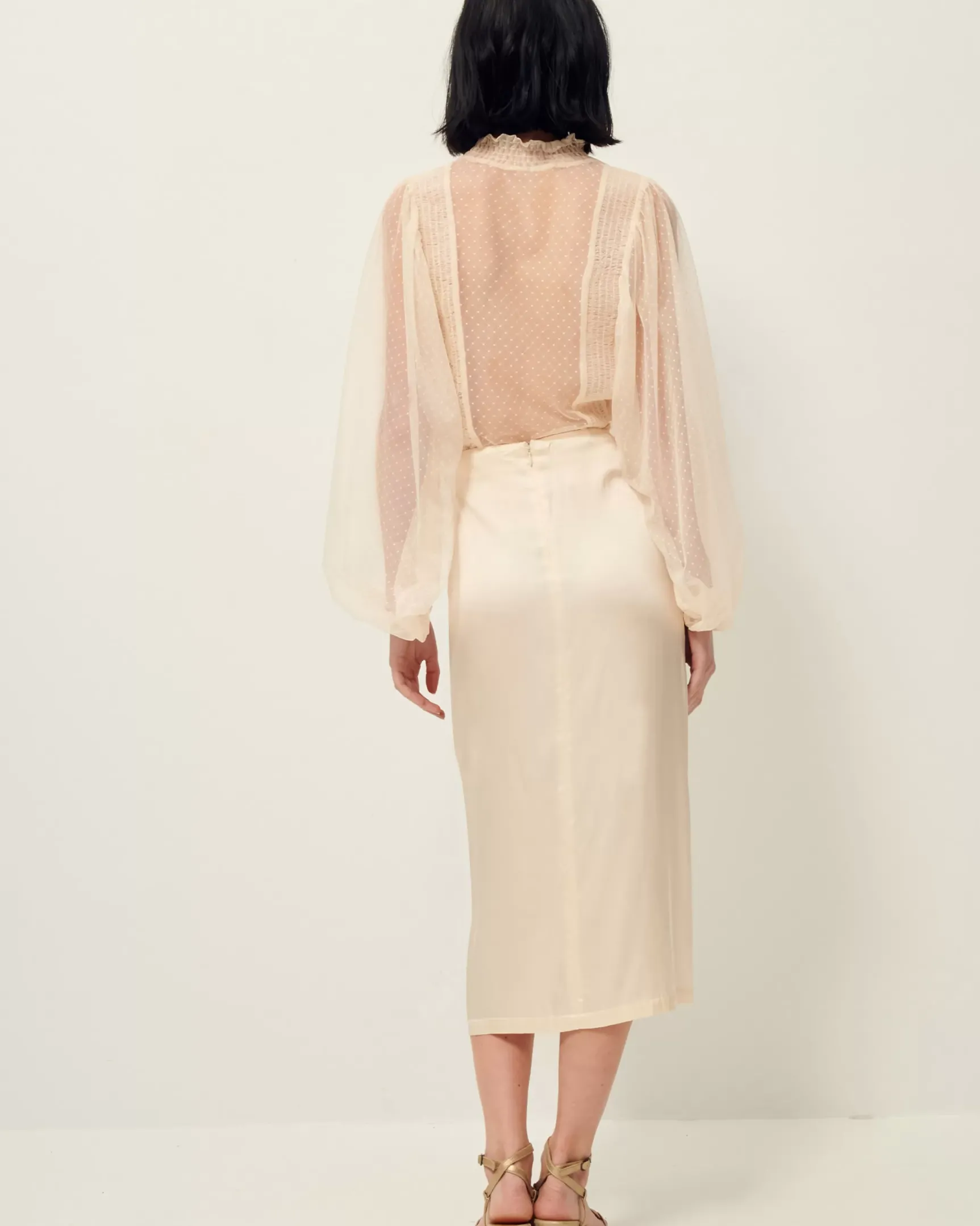 Jupe mi-longue fendue en satin fluide de viscose.