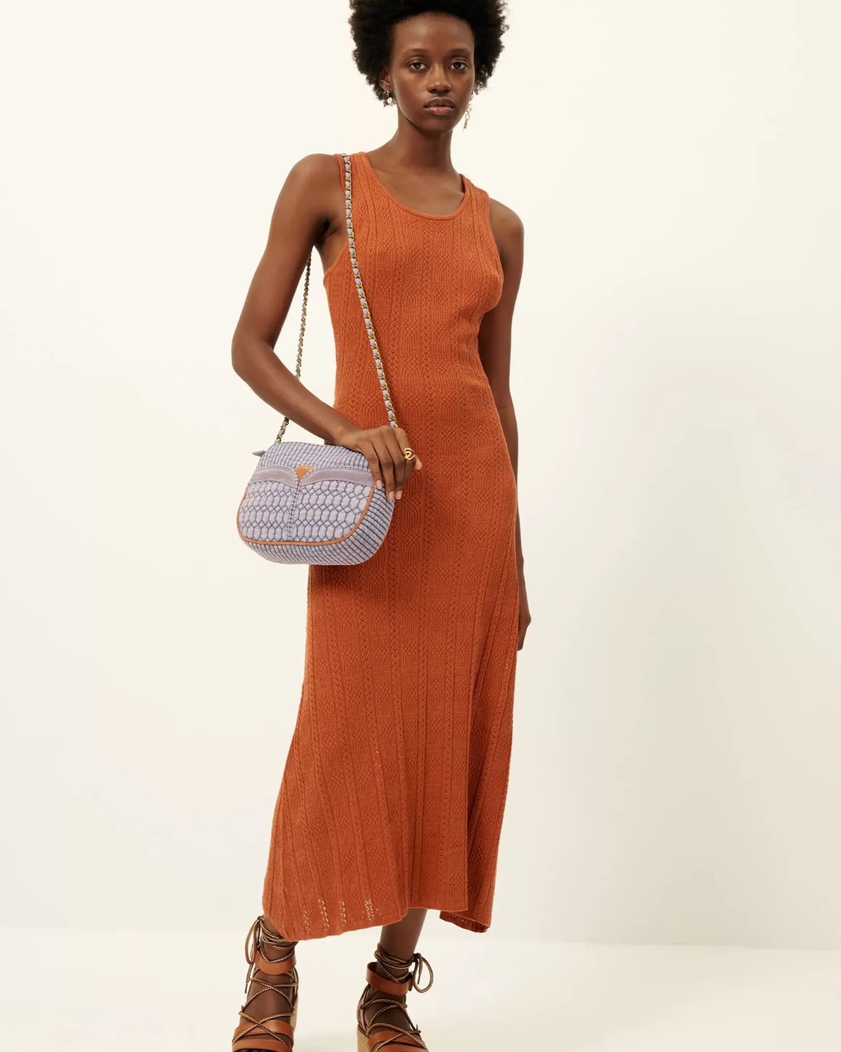 Robe longue à larges bretelles croisées au dos en maille fantaisie à points ajourés.
