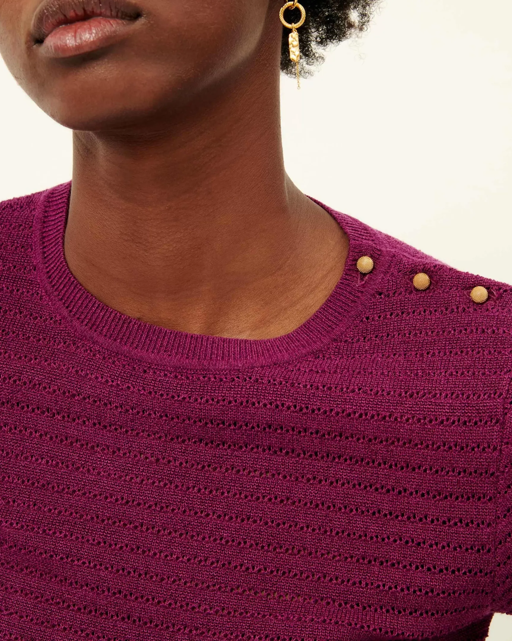 Top court boutonné à l’épaule en maille fine ajourée.