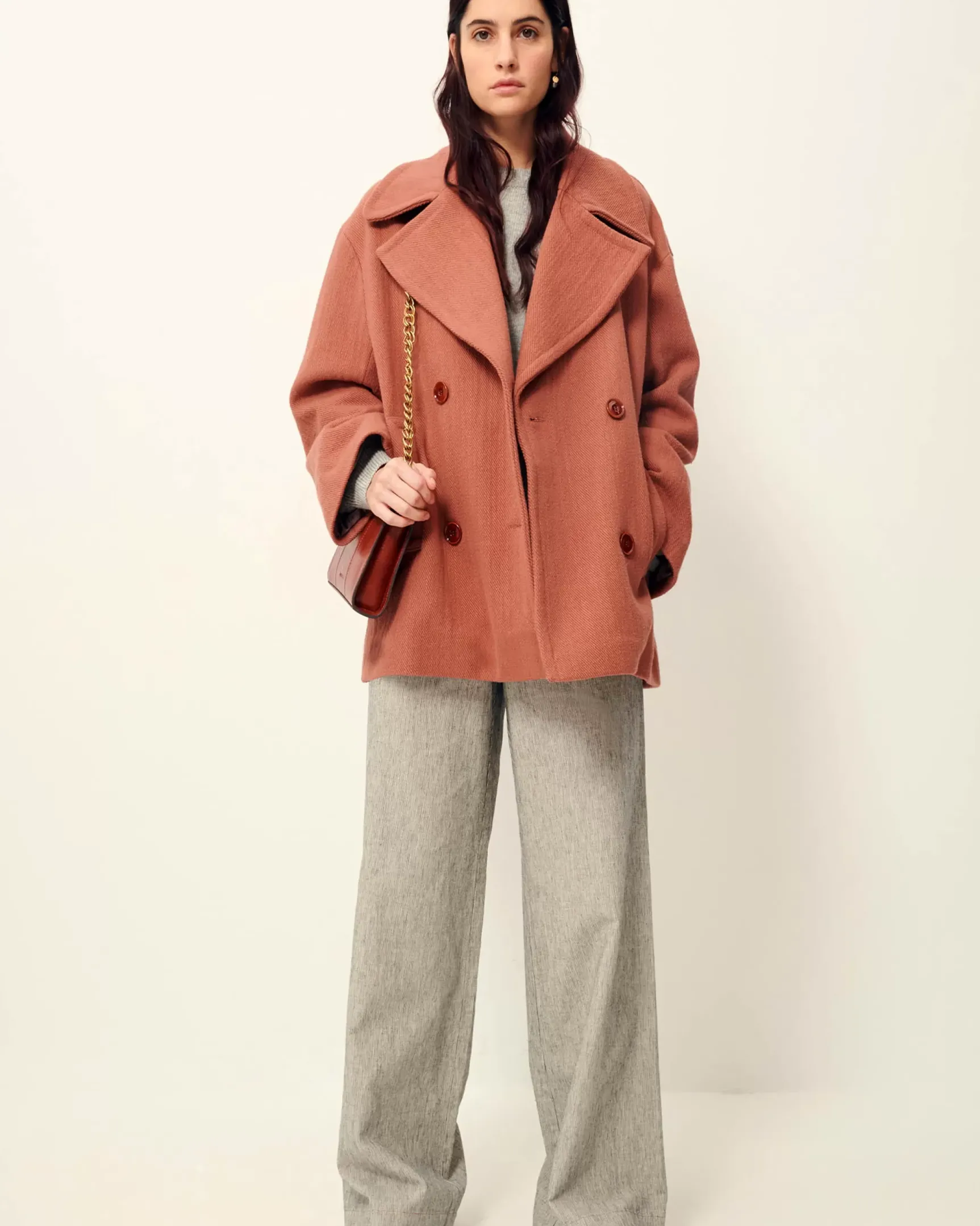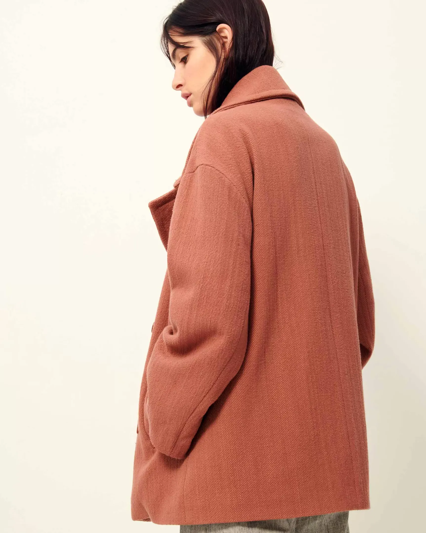 Caban oversize à double boutonnage en tricotine de coton de fils bourrette recyclés tissé en Italie.
