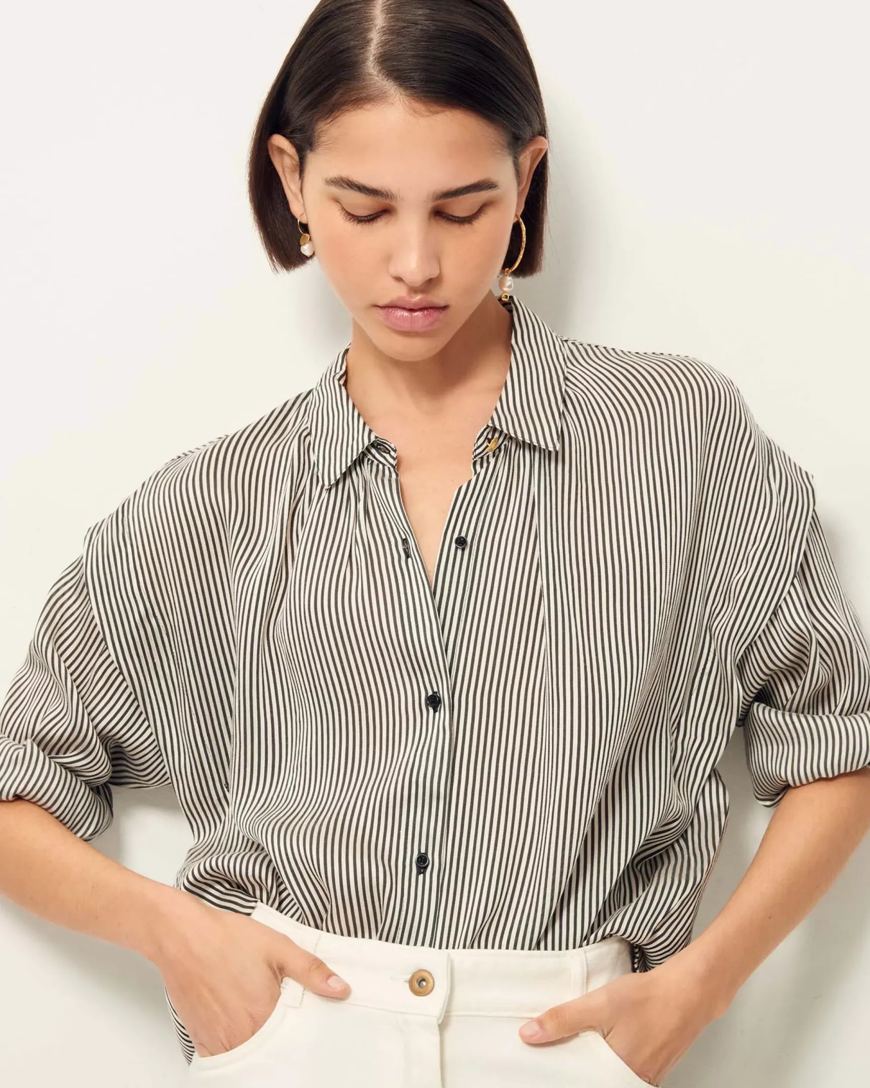 Chemise ample avec détail de pli plat sur les côtés en jacquard dobby de viscose soie rayé bicolore tissé en Italie.