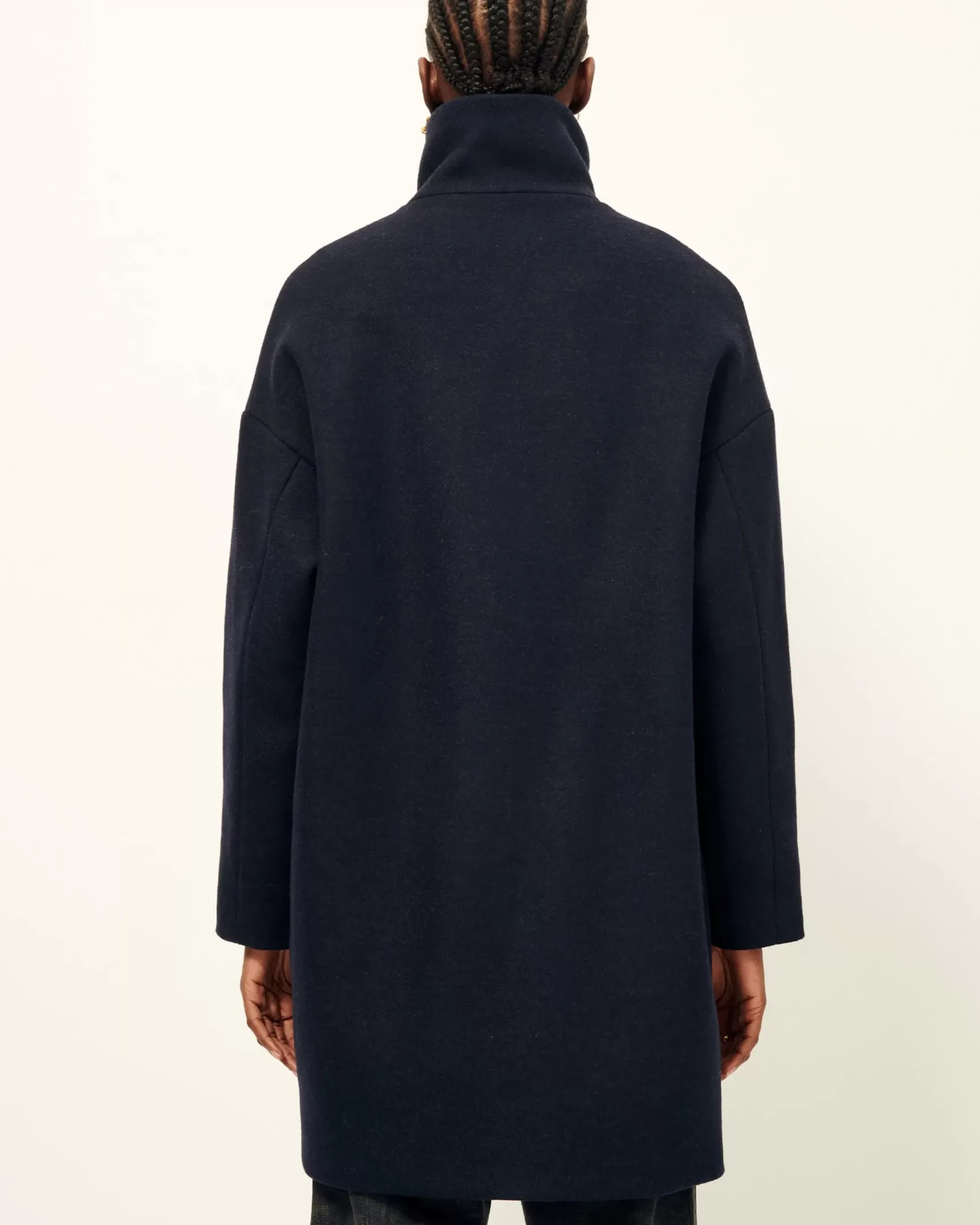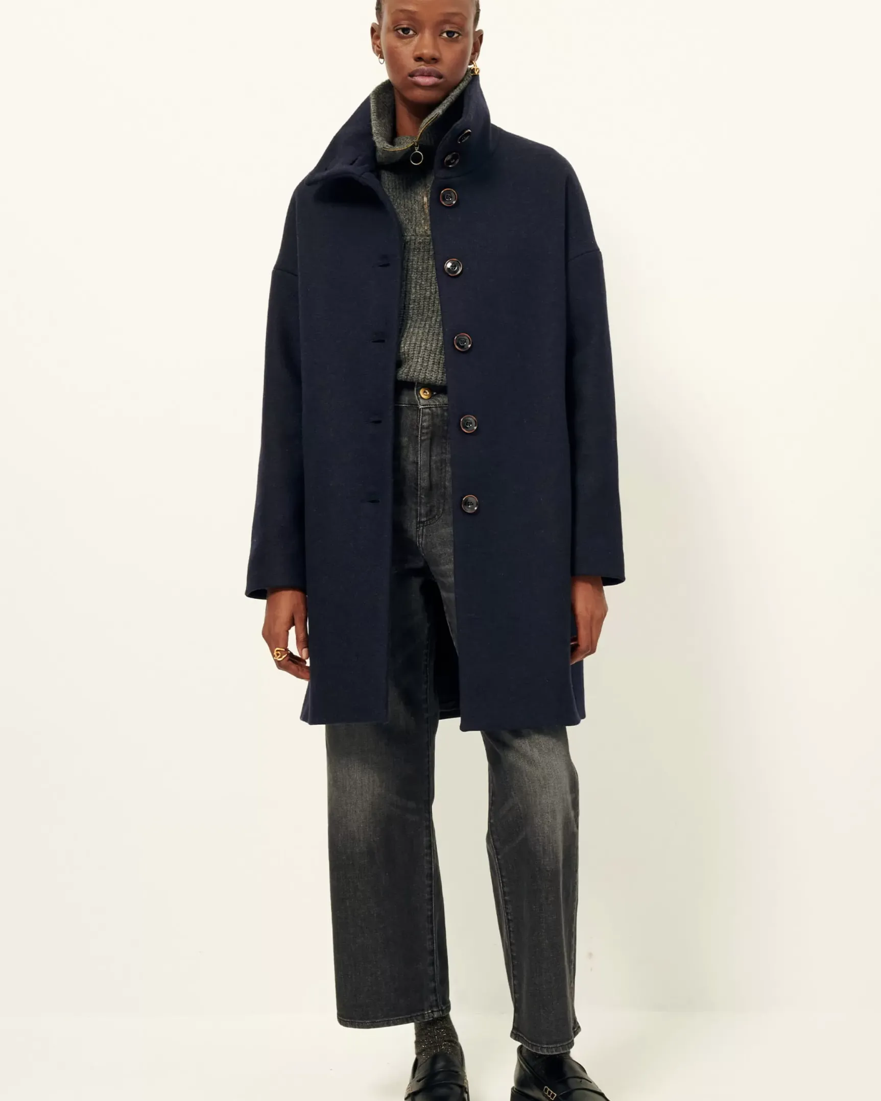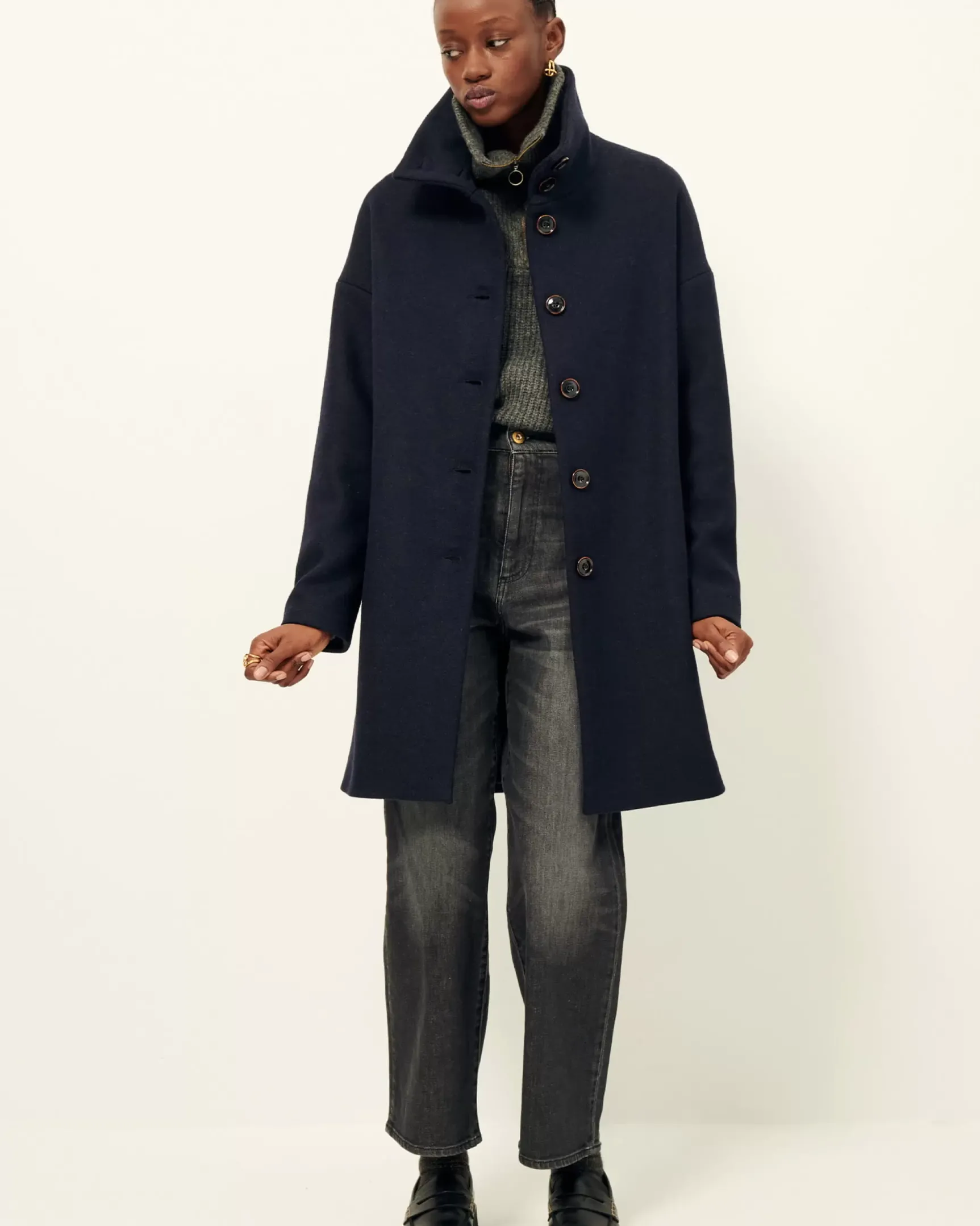 Manteau droit mi long à col montant en double tissage armuré chiné tissé en Italie.