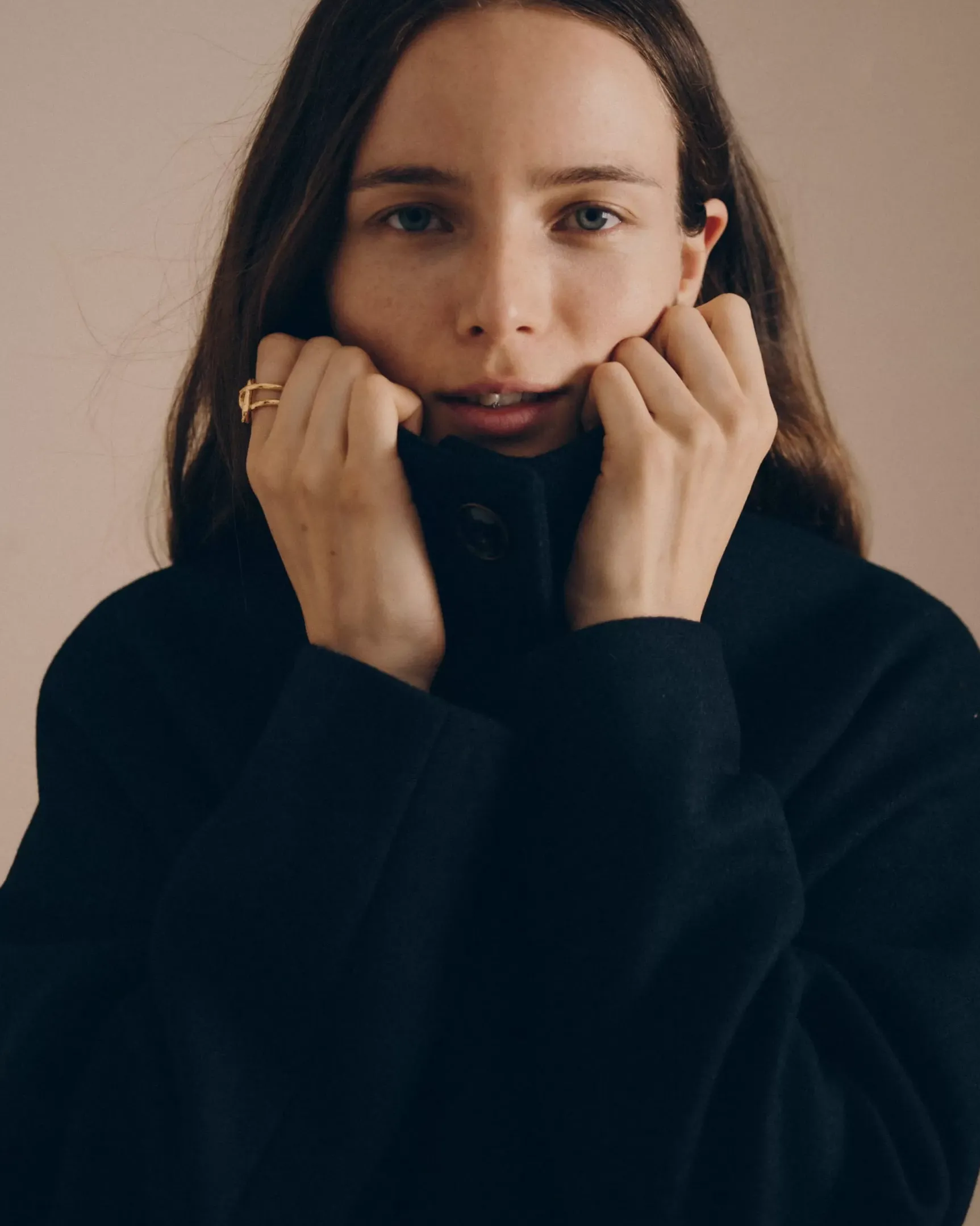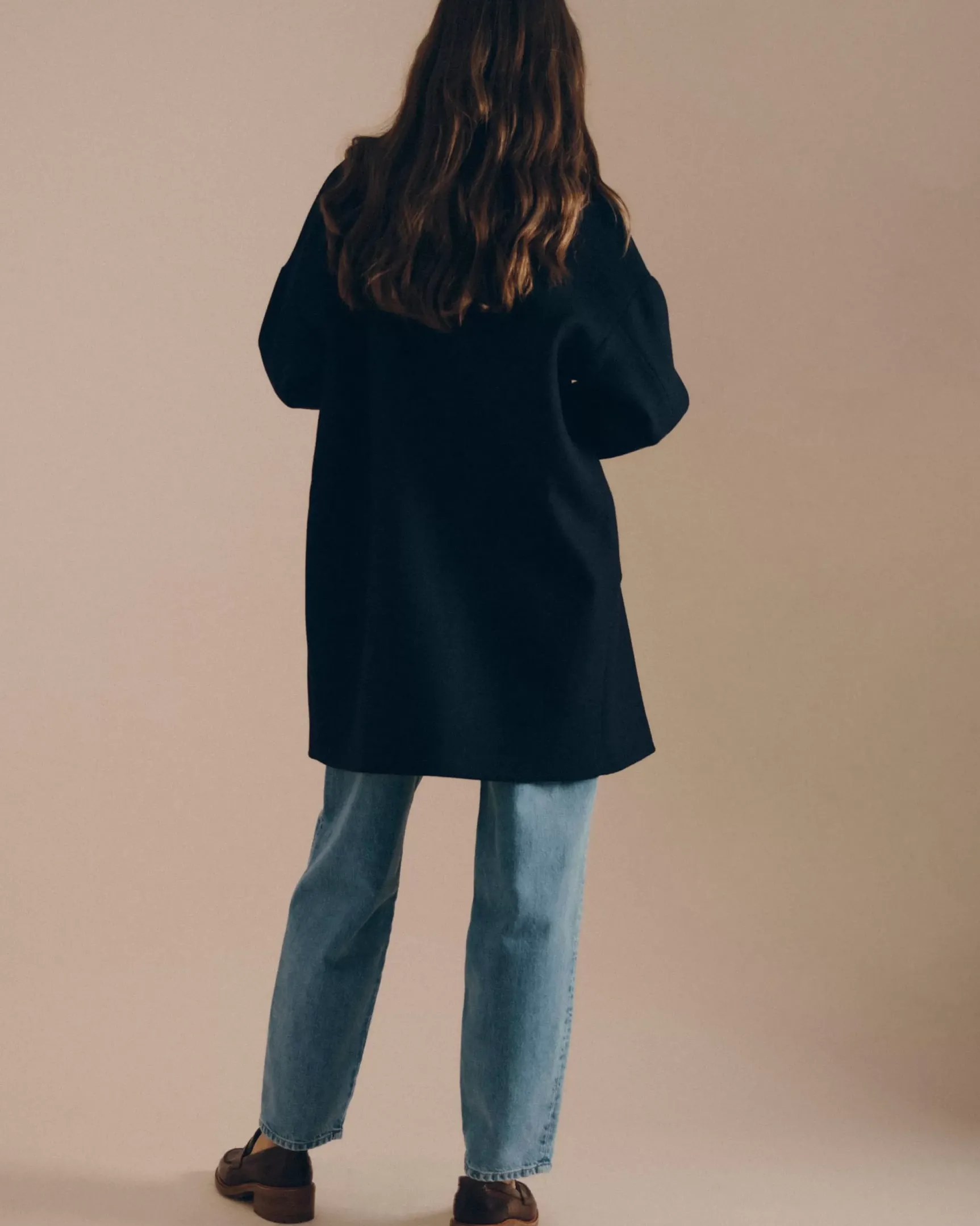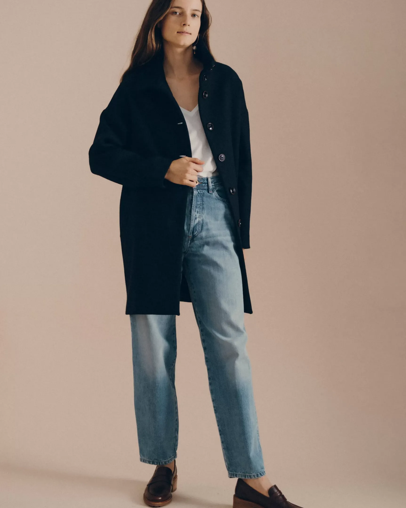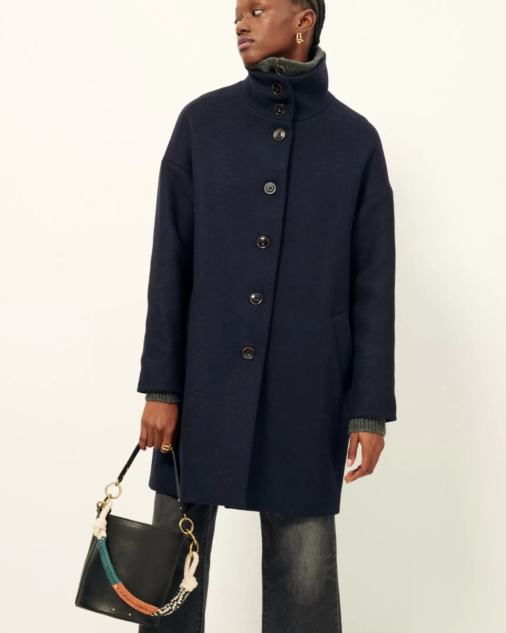 Manteau droit mi long à col montant en double tissage armuré chiné tissé en Italie.