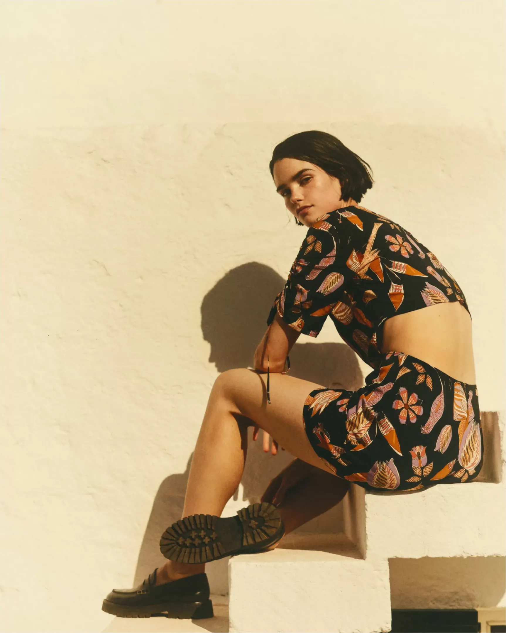 Robe courte ouverte au dos en toile de viscose fluide et aérienne imprimée, motif exclusif Sessùn.