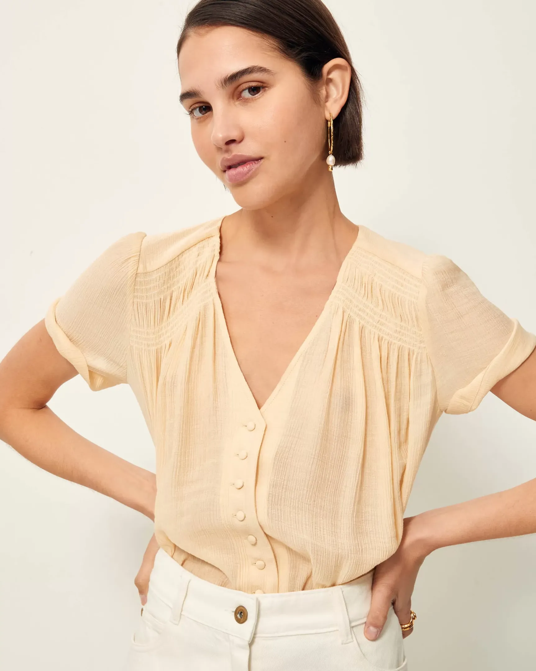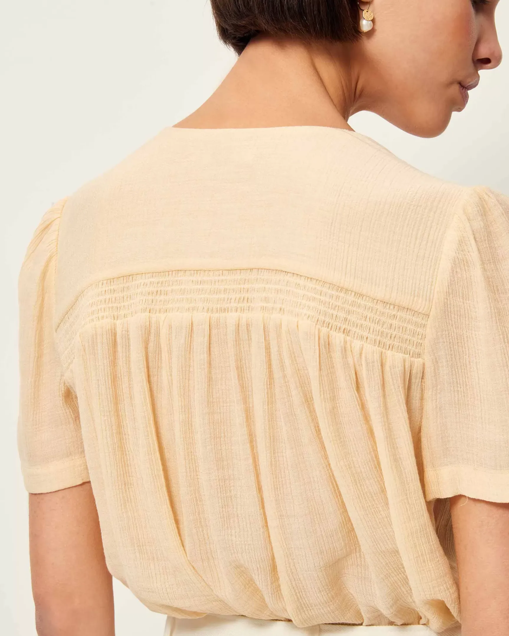 Blouse smockée en satin effet armuré et gaufré.