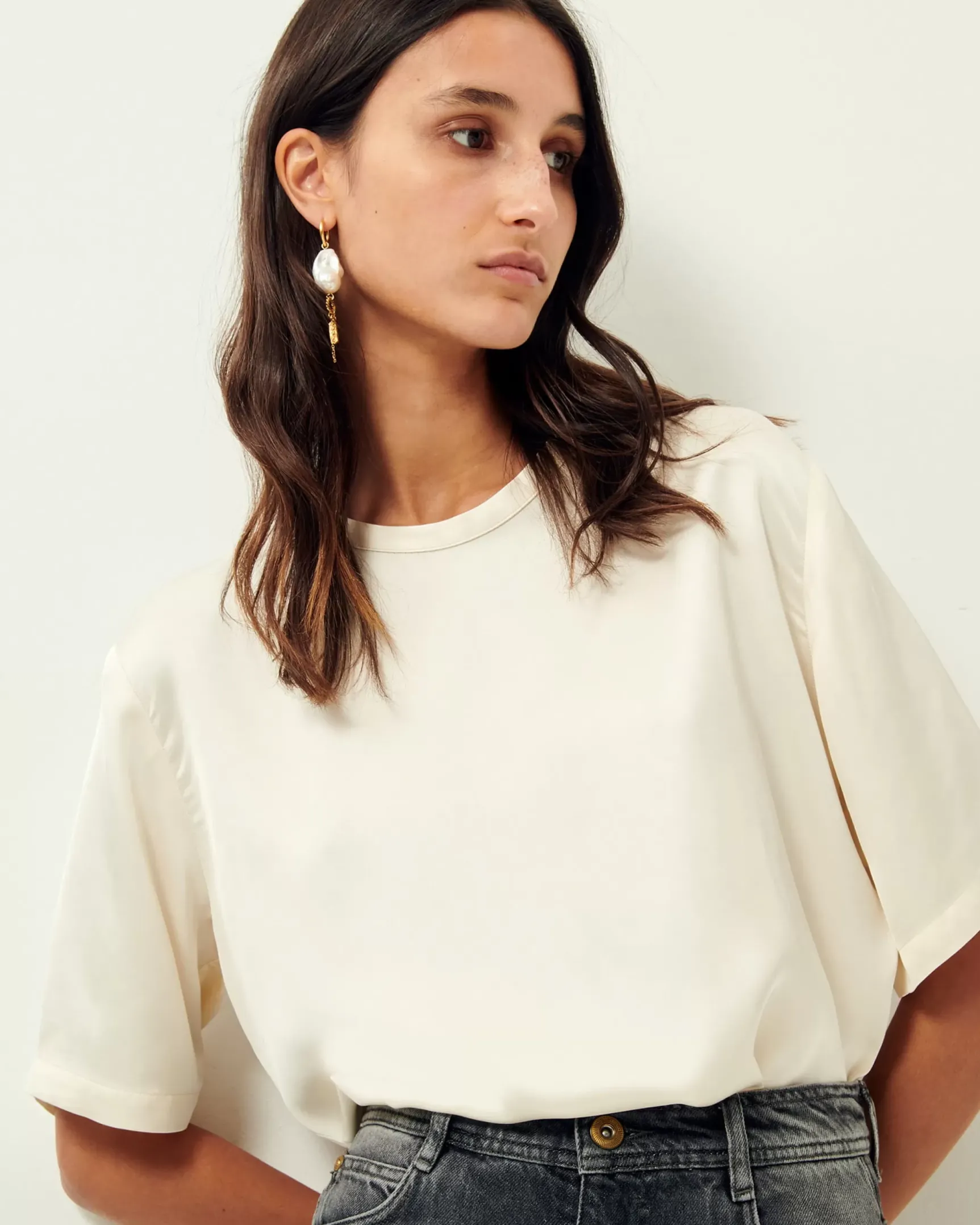 Top à manches courtes en satin fluide de viscose tissé en Italie.